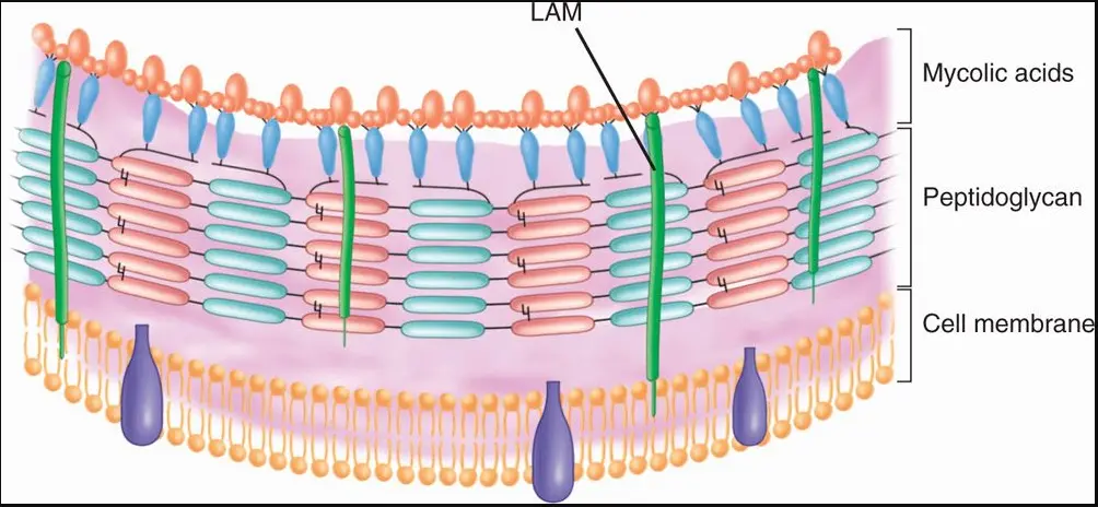 - Arabinogalactan: A polysaccharide that links the peptidoglycan to lipids.